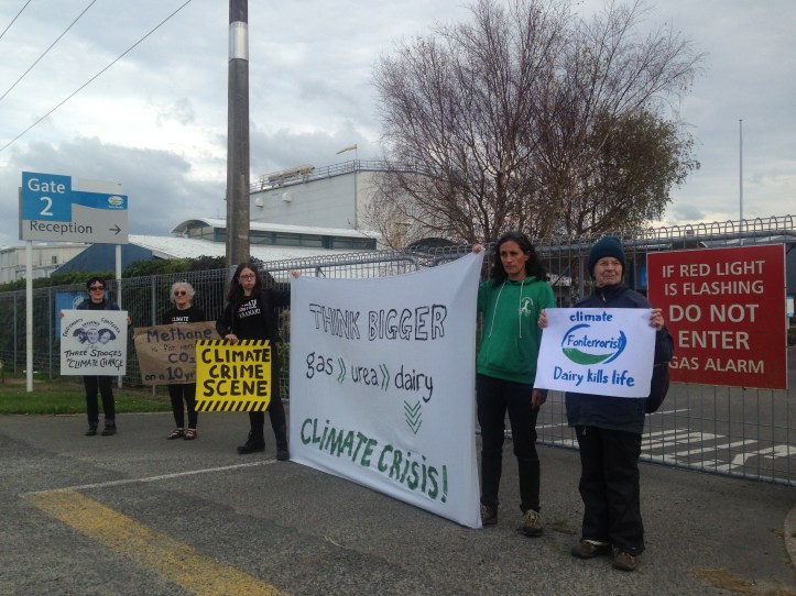 “We also want everyone to see the massive dependence of this country’s industrial dairy farming on fossil fuels for fertiliser, machinery, transport, processing and packaging. The government announced today that the new Zero Carbon Act will split agricultural emissions from fossil fuel emissions and only demand a 10% gross reduction on 2017 methane levels by 2030. We say this is not good enough.”