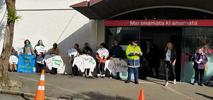 Members of Climate Justice Taranaki and other community groups gathered with white elephants outside the launch of the National New Energy Development Centre today by Prime Minister Jacinda Adern and Energy Minister Megan Woods. The protesters are opposed to the government’s support of Hydrogen technology.