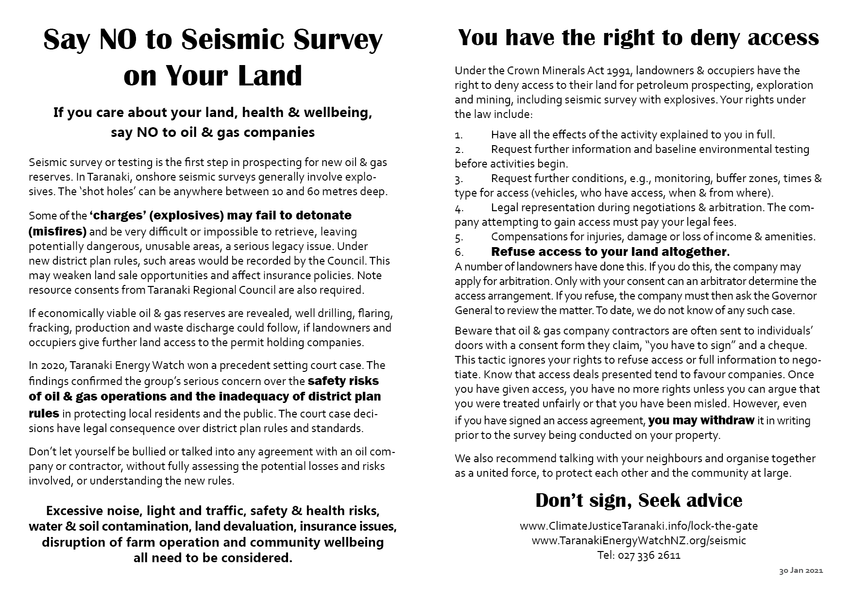 As landowners/occupiers of ___________________________________ (property) I/we withdraw permission to enter our property for seismic surveys using explosives (Crown Mineral Act 1991 Section 53) and I/we withdraw written approval for the discretionary resource consent for the discharge of contaminants by detonation of explosives, the degradation of undetonated charges (misfires), and drilling of holes (Resource Management Act 1991 Section 95E).