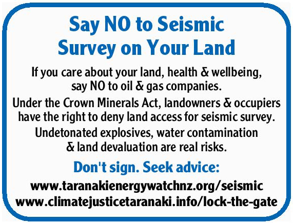 Greymouth Petroleum is currently trying to gain access and agreement from landowners/occupiers to conduct seismic surveys across large areas of Taranaki, in search for more natural gas. If it eventuates, the seismic plan, spanning seven petroleum exploration and mining permits, some 270 sq km, will affect thousands of households and farms.