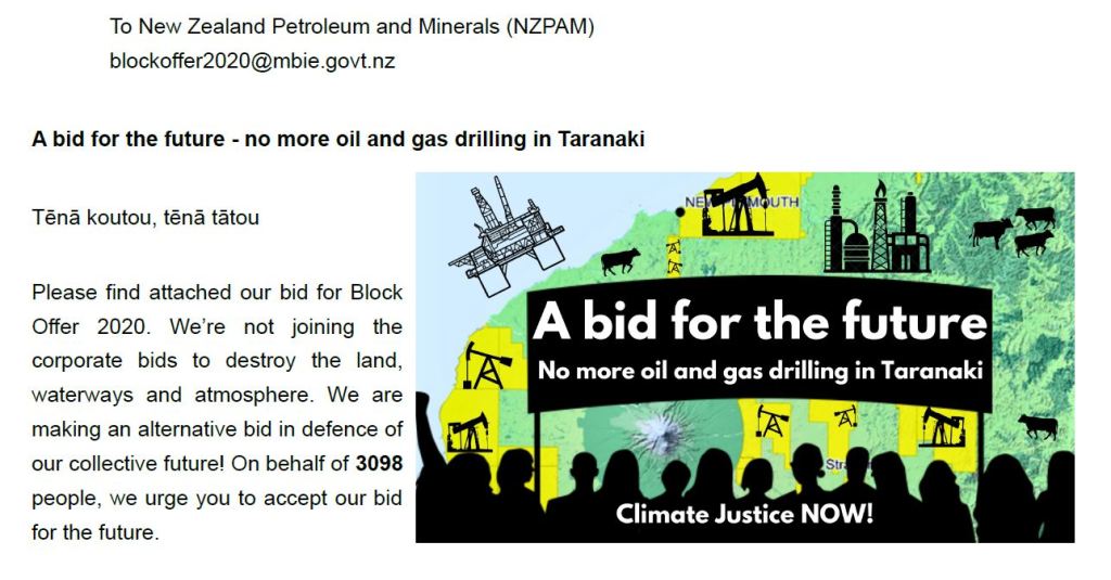 “The government’s Block Offer 2020 tender for oil and gas exploration permits covers over 20% of the Taranaki region. Today, we have formally lodged our Block Offer bid to end all oil and gas drilling in Taranaki. To consider further fossil fuel drilling in the middle of a climate emergency is completely irresponsible. Despite politicians saying that climate change is a priority, successive governments have failed to create meaningful change. It’s now up to us to rise up together for climate justice.”