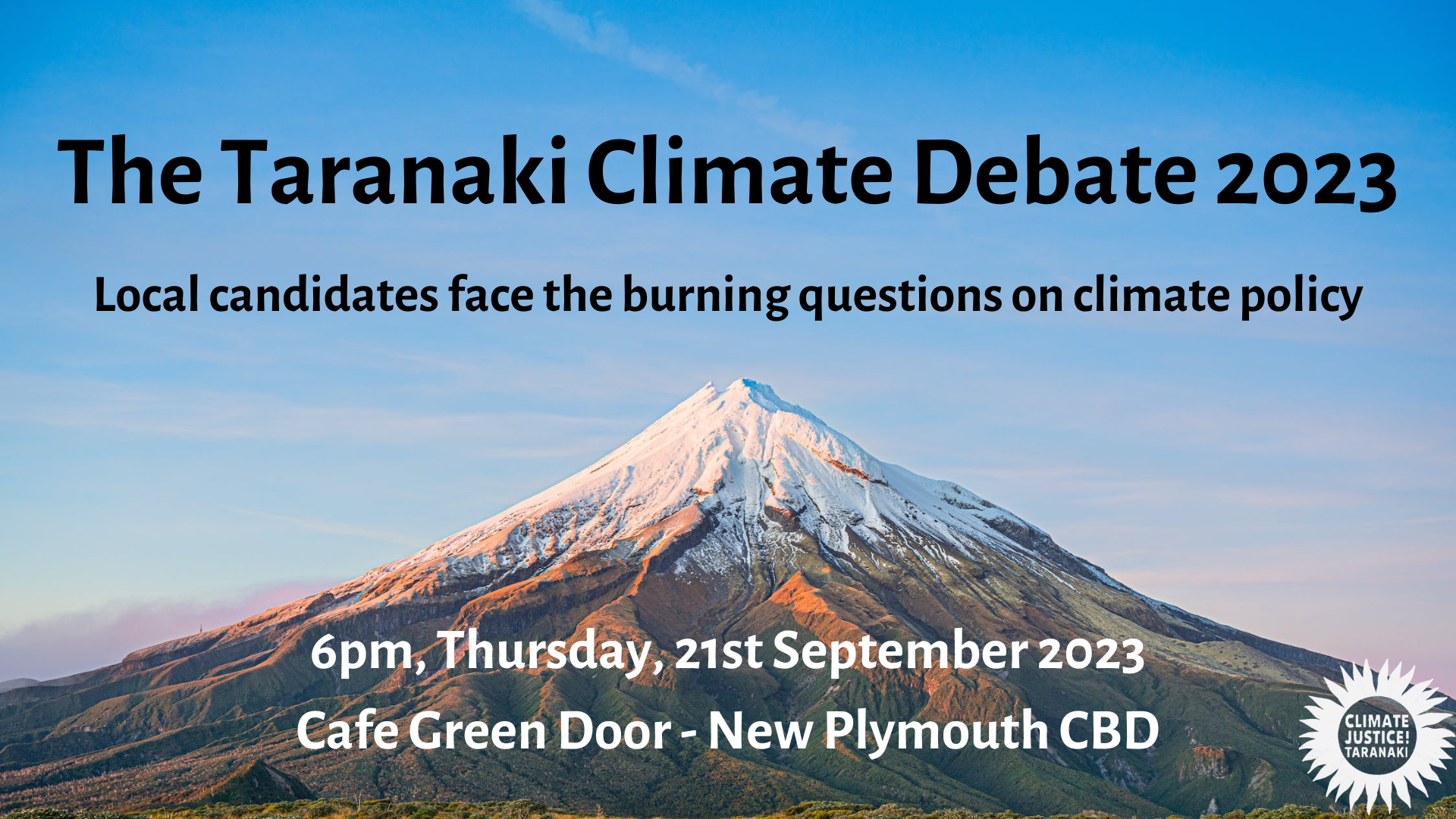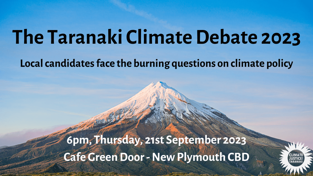 Local candidates face the burning questions on climate policy. Will they fiddle about while the planet burns? Or will they and their party take decisive action for your future? We are hosting this debate with the aim of creating dialogue while asking the difficult questions of how we can collectively work for systemic change to ensure a future for the next generations. Join us at Café Green Door, 17 Brougham Street, New Plymouth, on Thursday, 21st September at 6pm. Doors open from 5pm so come along, grab a bite to eat and be part of this stimulating event. We have set up a Facebook event here: https://www.facebook.com/events/637833721749573