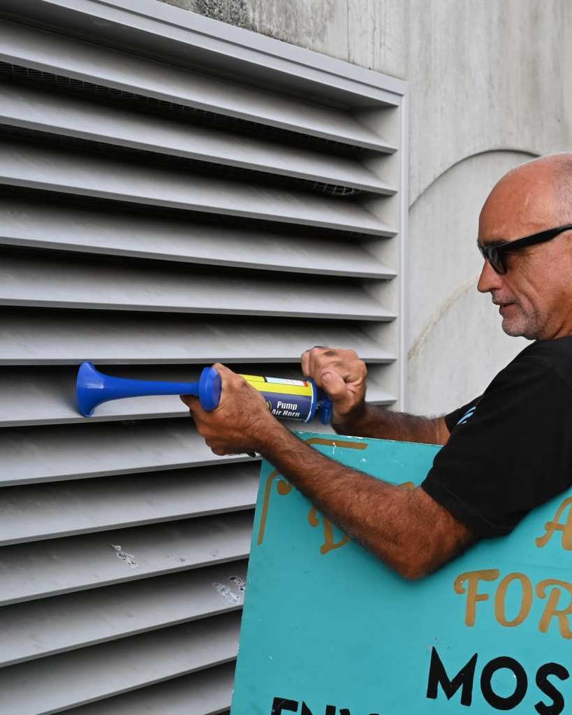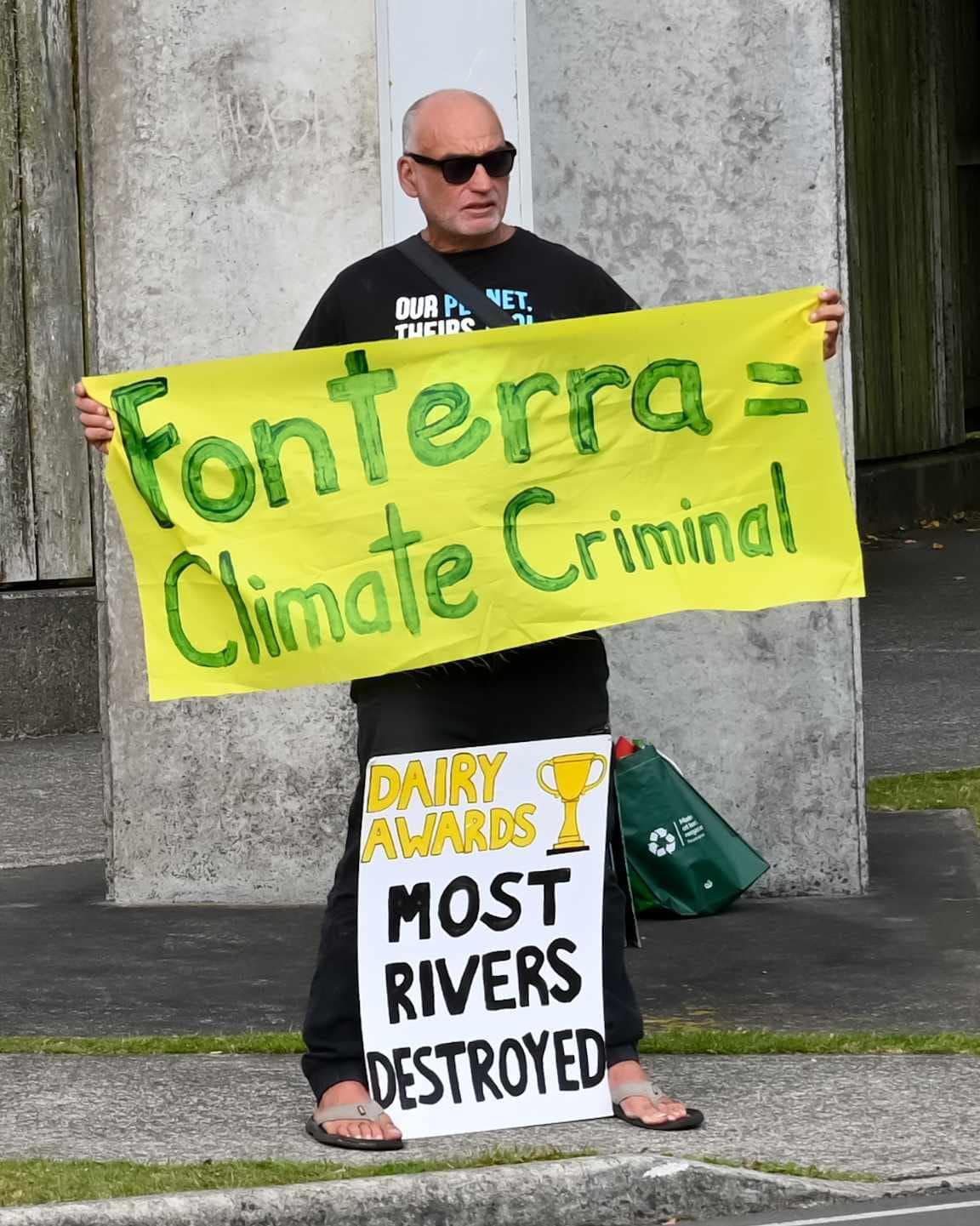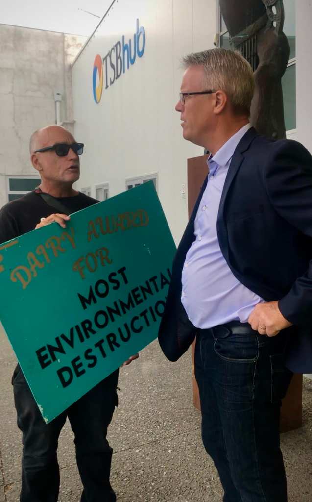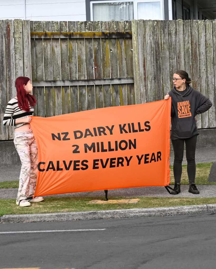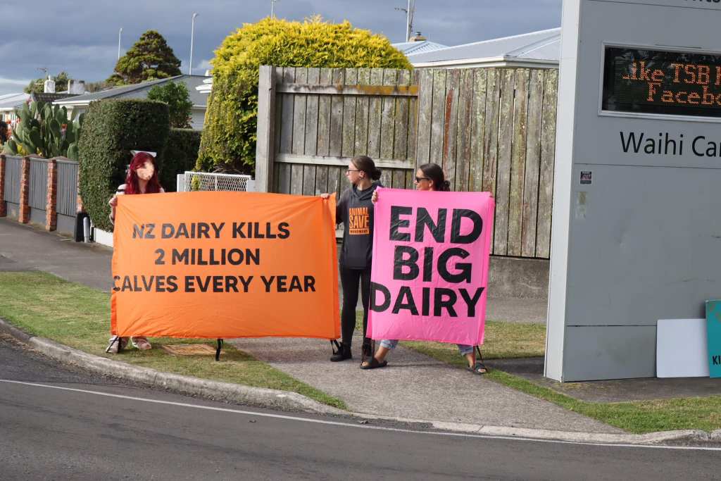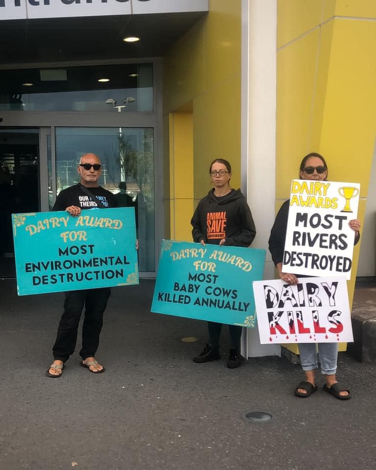 Community groups from the End Big Dairy campaign protested the Dairy Industry Awards event again, in Te Hawera on Saturday, with banners, placards and air horns, to critique the industry’s exploitation of animals, the environment and workers.