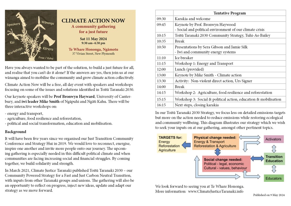 In March 2021, Climate Justice Taranaki published Toitū Taranaki 2030 – our Community Powered Strategy for a Fast and Just Carbon Neutral Transition, with inputs from other Taranaki groups and unions. The gathering will also be an opportunity to reflect on progress, inject new ideas, update and adapt our strategy as we move forward.