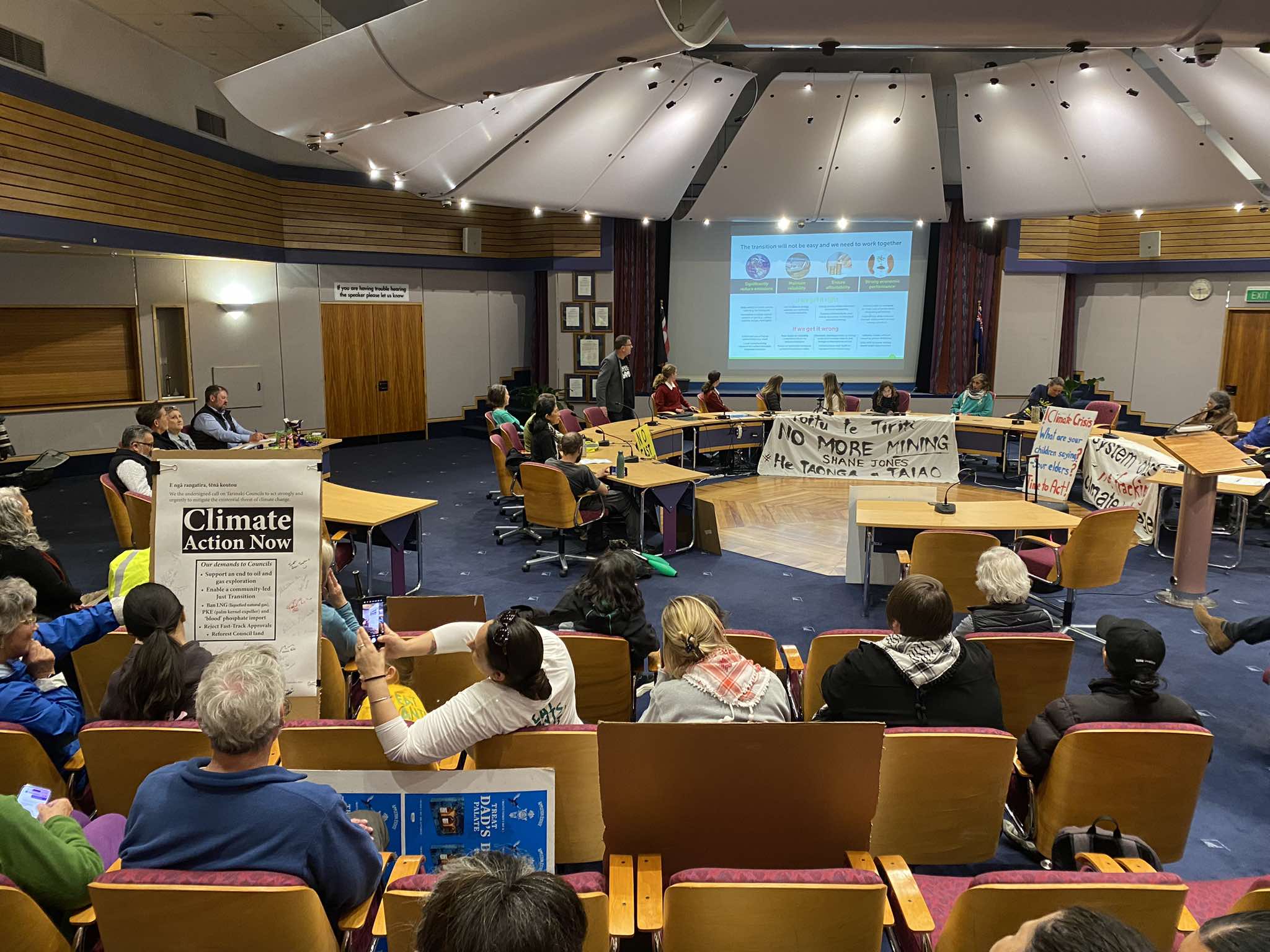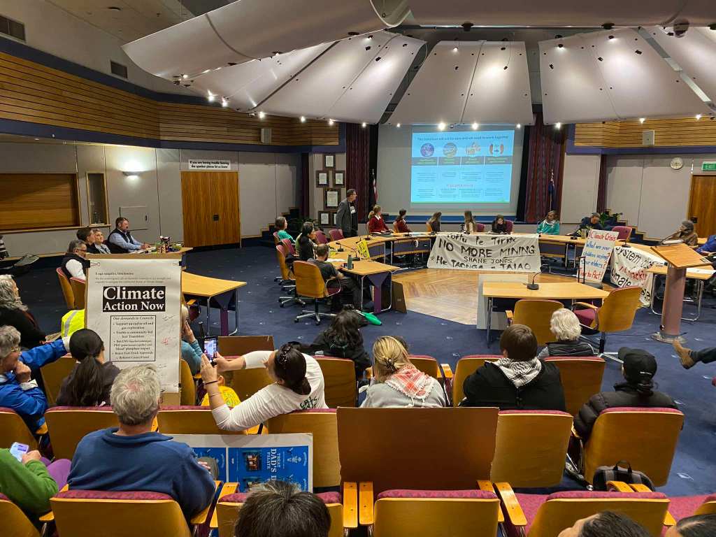 A climate protest turned into a people’s assembly inside the New Plymouth District Council chamber where rangatahi, mana whenua, grandparents, scientists, and community members addressed Mayor Neil Holdom demanding urgent actions to bring down emissions and support for the ban on offshore oil and gas exploration.