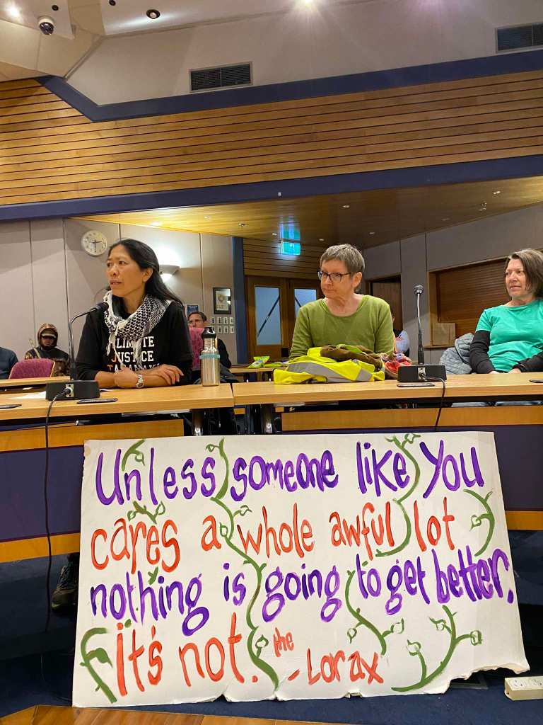 Rangatahi brought their concerns for the future and the lack of action by politicians, and others rebutted the mayor’s pro-industry presentation reminding him that we have known there will be energy crises and job layoffs but the solution is not to go back to dirty fossil fuels.
