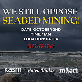 Join KASM (Kiwis Against Seabed Mining) to show our full support for mana whenua’s continued and steadfast opposition to Trans-Tasman Resources‘ seabed mining application in the South Taranaki Bight. Meet at the Aotea waka in Patea at 11am for a hikoi to the beach.