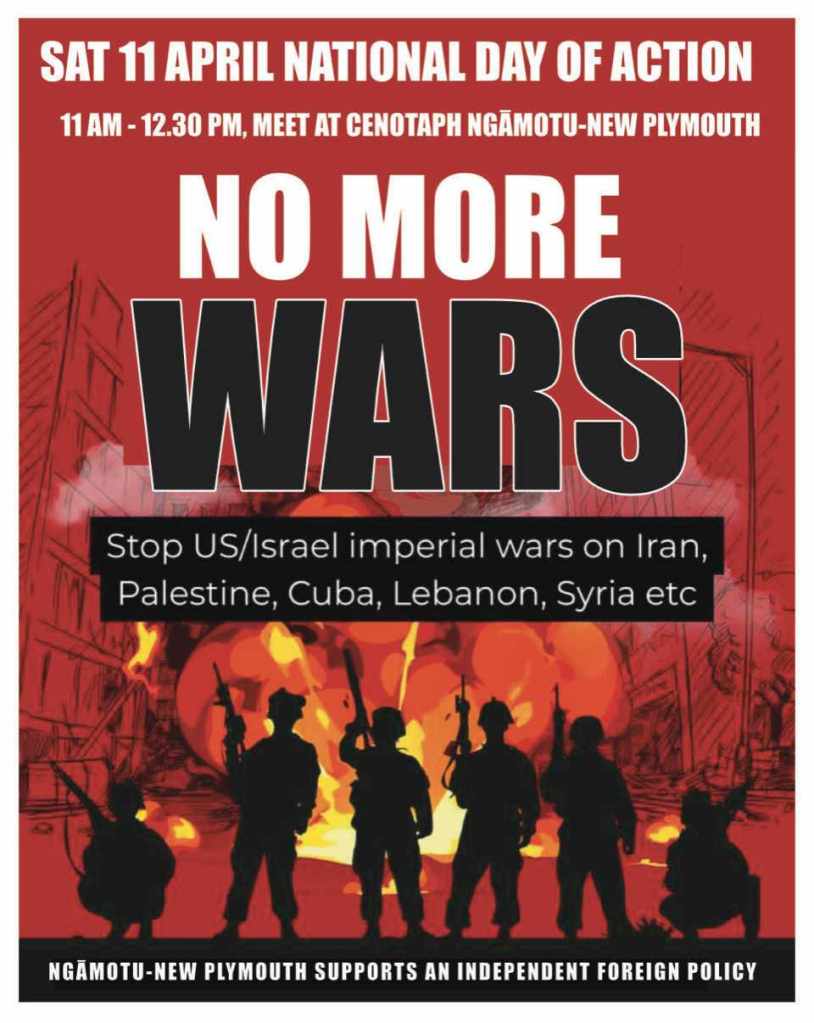 Together with Palestinian Solidarity Taranaki and others, we will rally for the nation-wide event No More Wars, to stop US/Israel imperial wars on Iran, Palestine and others. In addition to the immense misery these wars cause to people’s lives, the US military is also the largest greenhouse gas emitter of any institution on Earth. Come along to the rally for peace and justice.