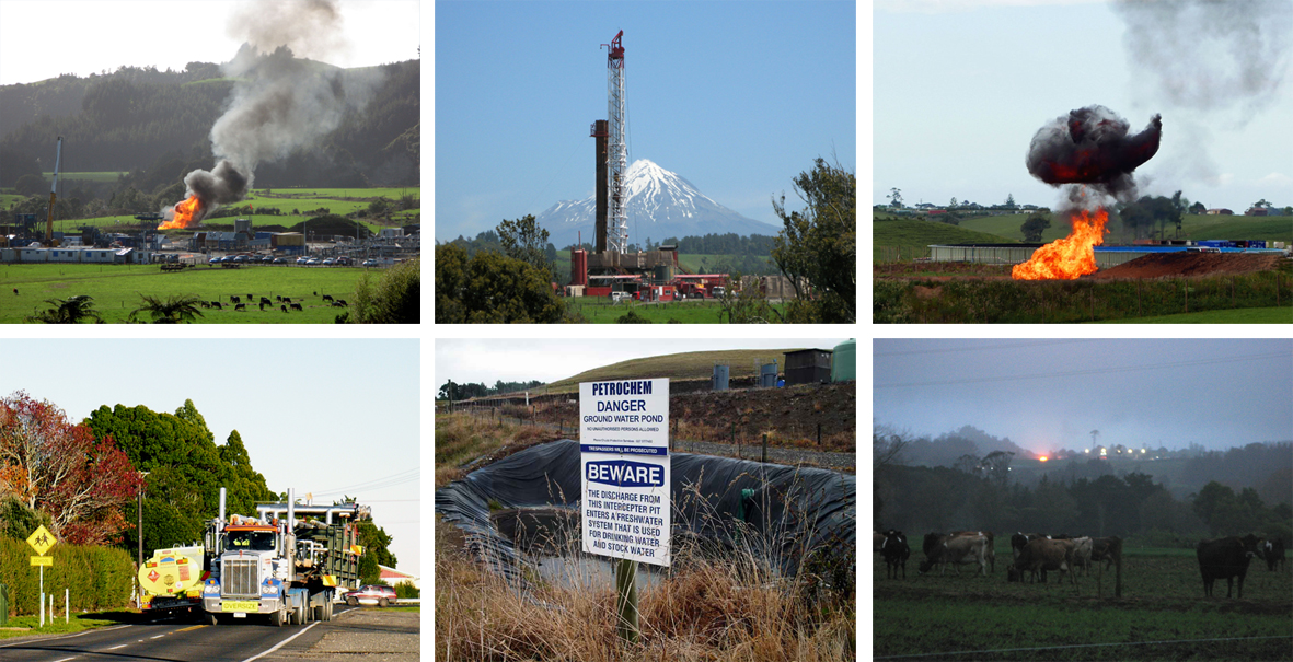 When asked what it’s like living there, she said “My photos tell the story of living in Tikorangi gas lands.” She called her photo taken on 29 Dec 2014 (top right of collage) of Mangahewa-E wellsite, “Todd Energy’s genie out of the flare pit.”  Fiona Clark, 3 Jan 2015