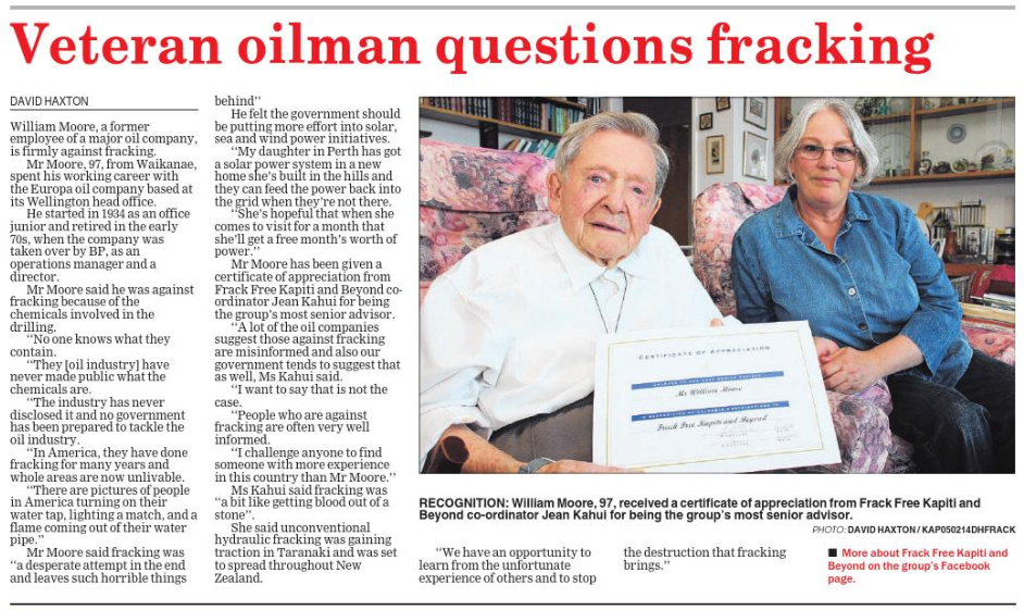 97 year old William Moore, from Waikanae, started working for the Europa oil company in 1934 and retired in the early 70s as an operations manager and a director. He is against fracking because of the chemicals involved. “No one knows what they contain … The industry has never disclosed it and no government has been prepared to tackle the oil industry…” William Moore